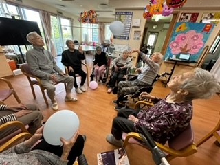新聞紙を追って頂いたり、風船バレーを楽しんだり
