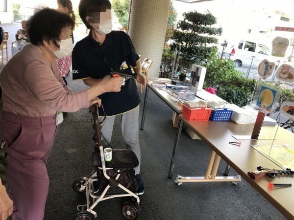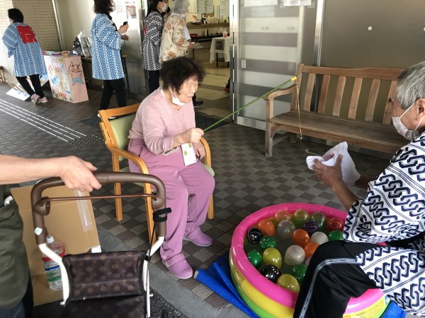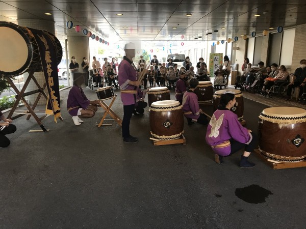 出店にご案内する際には、混雑を避けるために御利用者様を時間差で誘導いたしました♪1Fに降りた後出店に素早く向かい、何店舗も廻られる方が何名か居らして少し驚きました!休憩所でドリンクを飲みながらたこ焼きや、ベビーカステラ、甘酒、大根おでんに舌鼓を打たれたり、定番のヨーヨー釣りや射的、輪投げで見事に景品をゲットされる方もいらっしゃいました。一度ユニットに戻った後に、今回のメインイベントともいえる太鼓を鑑賞しました!アンコールにも答えて下さり、途中で太鼓を叩かせて下さったりと大盛り上がりでした!ご利用者様が、「自分の体が太鼓になったみたいにずっしりと響いたね~」とお話ししながらユニットに戻りました。保谷和太鼓の皆様、ありがとうございました!