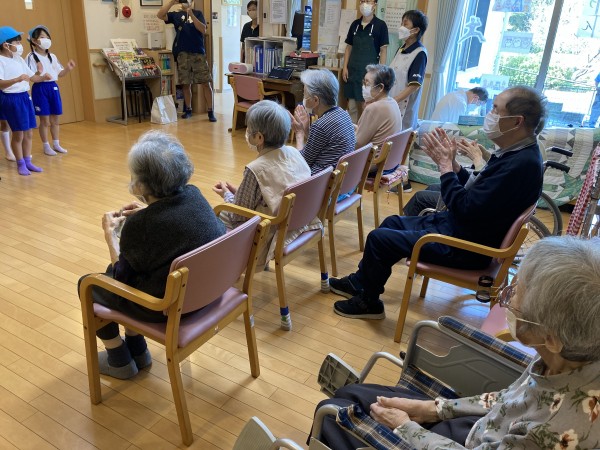 園児達の歌声に思わず笑顔になって、皆さん手拍子で応援しています。