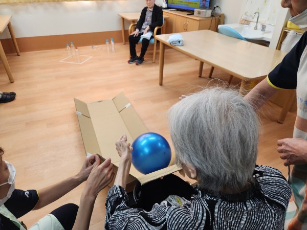 ※ご利用者様の状態に合わせて段ボールで作った投球補助台を使用します。