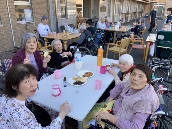 天気の良い日は外気浴も兼ねて外でおやつを召し上がって頂いています。