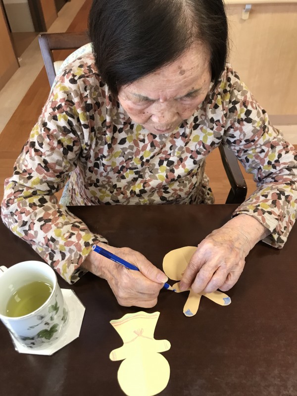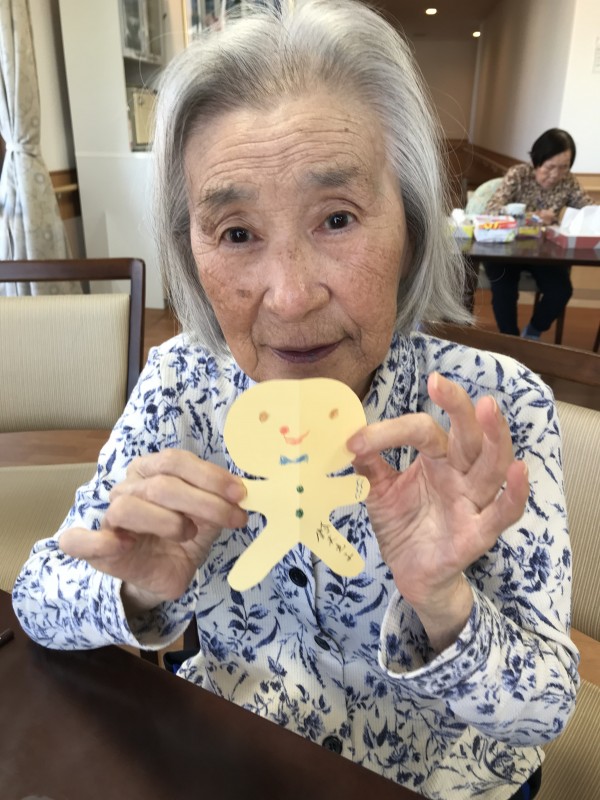 とは言え、クッキーは焼けなかったので、画用紙を代用して人型に切り、ご利用者様に顔やデザインなどを書いていただき、オリジナルジンジャークッキーを作りました。