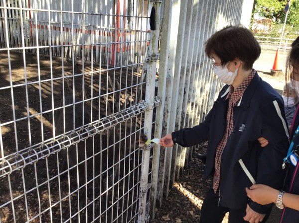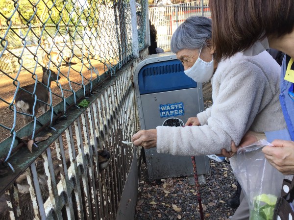 少し怖いという利用者様はスタッフと一緒に鹿に餌やりをしていきます。
