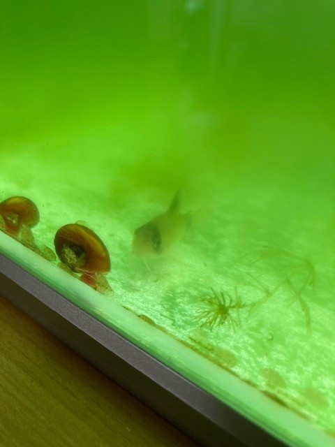 メダカの水槽に、コリドラスと言う南米原産ナマズもいます、主に残ったエアを食べます。水槽の掃除屋さんです。たまに卵を生みますが、ラムズホーンに食べられるので、繫殖はできません????