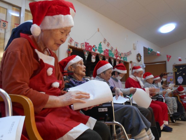 入居者様にもサンタ帽をかぶっていただき、合唱やスタッフの寸劇などを楽しんでいただきました。