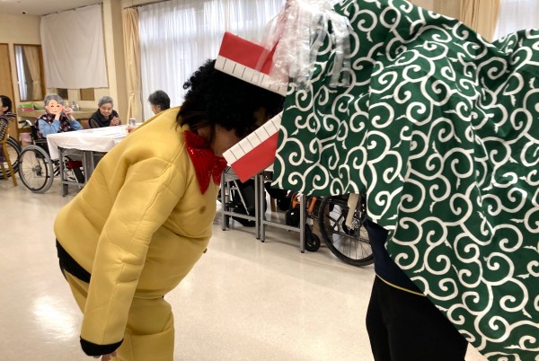 獅子舞による華麗な舞いの後は、愉快なスタッフによる二人羽織です\(^o^)/