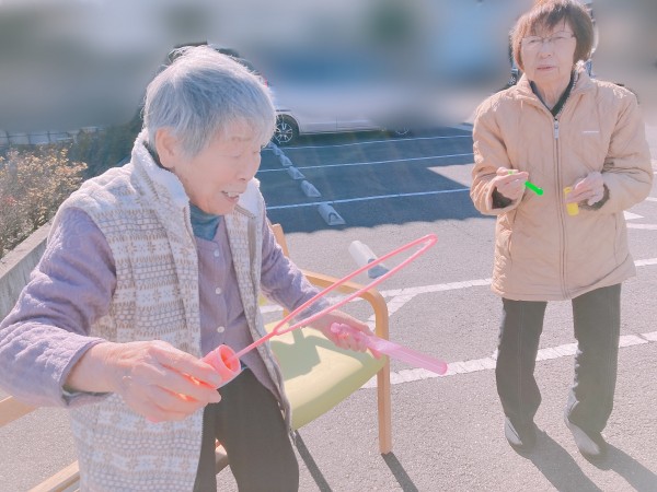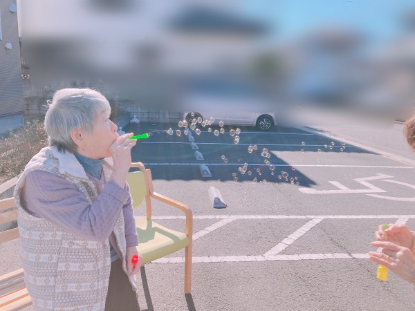職員の方に風が向いたときは職員がシャボン玉を体いっぱいに浴びました(´▽`)