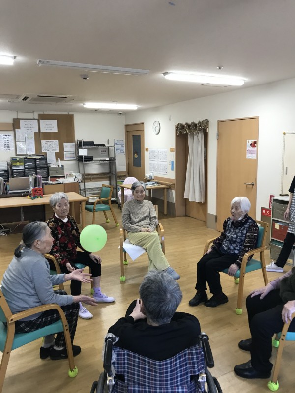 私達は最初自身の手で風船を繋げて楽しくしていただいたのですが、手だけでは届かない