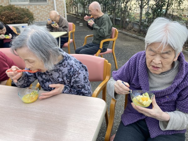 職員とじゃんけん遊びの後は、みんなでフルーツカクテルを食べました(*^^*)