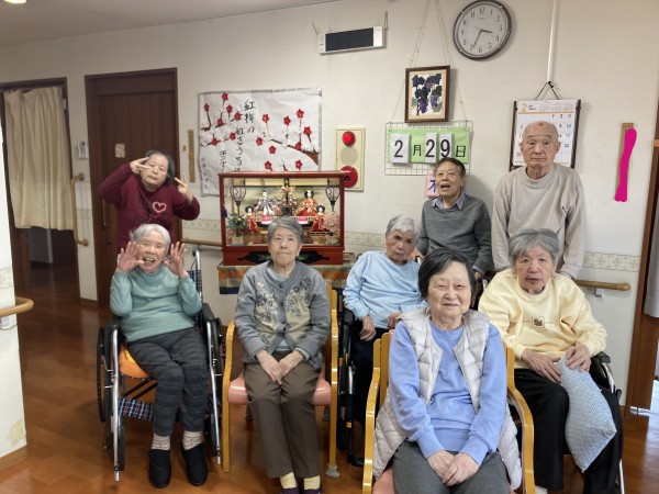 少し早いですが、雛飾りの前で記念撮影を行いました。