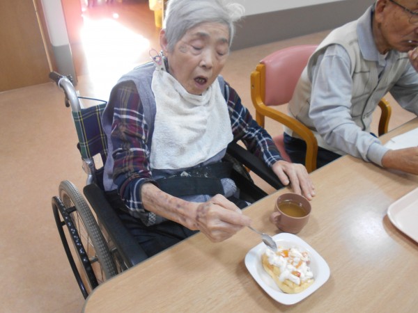 手作りのケーキの飾り付けを入居者様に手伝っていただき、皆様で頂きました。