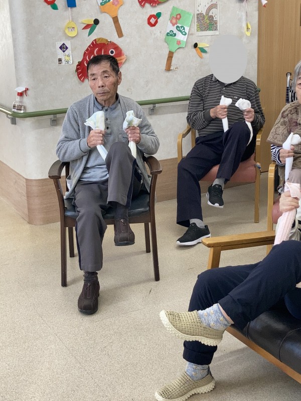遊びの要素を入れてタオルを使い、タオルをたたむ・握る・結ぶ・ほどく・投げるなど、指を動かすことで脳に働きかけながら、全身を動かし、体力維持向上を目指しながら楽しく体を動かすことを目的としている運動になります。