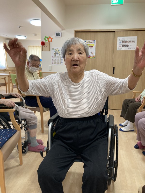 一階・二階の入居者様達と一緒に「タオル体操」を行いました。