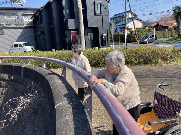 駐車場や庭先で外気浴をされる利用者様やホームから少し歩いた先の川沿いまで散歩された利用者様。