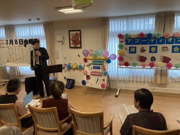 初めて、地域でボランティア活動しているアコーディオンの先生をお呼びしました!(^^)!アコーディオンの曲は昔懐かしい名曲ばかりで利用者様も懐かしみながら歌ってみたり、曲に聞き入っていました。
