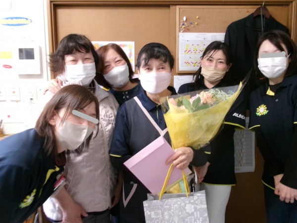 3/28 退職の朝 夜勤明け、最後の勤務を終えスタッフが続々と集まってきました。この施設で勤続23年間大変お疲れ様でした。これからは太極拳一筋に励むと話しておりました。優しい声掛けと素敵な笑顔、本当にありがとうございました!今度は遊びに来てね!