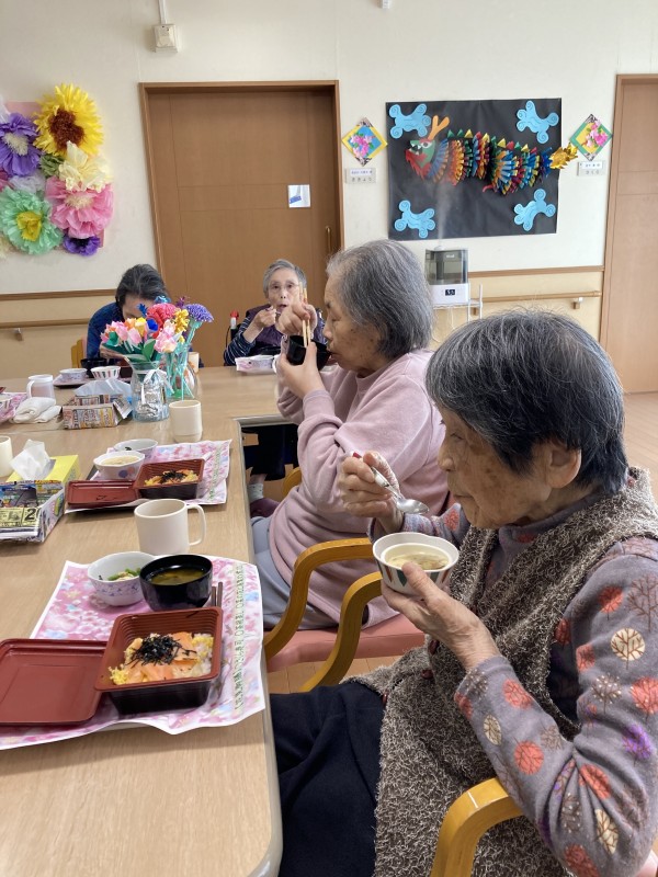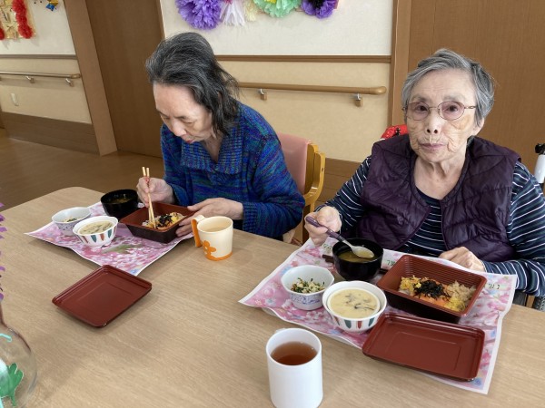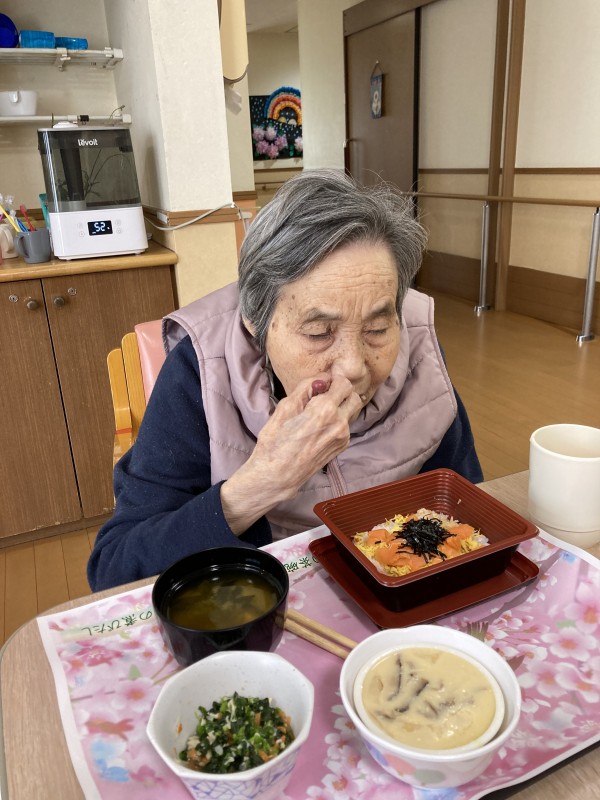 桜色のちらし寿司を春らしい柄の入ったお弁当箱に