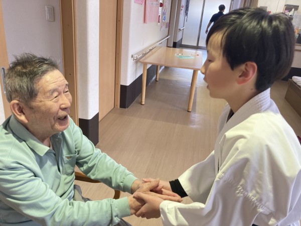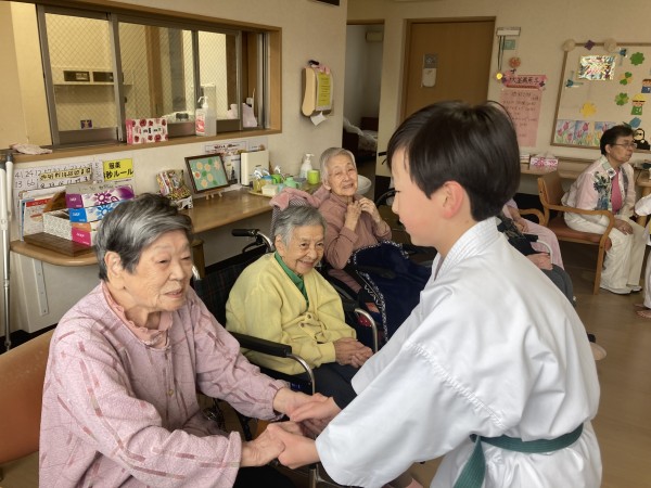 えいっ!やぁーーーー!!、はっ!!演武中、様々な掛け声とともに、ご利用者様の拍手と歓声がたくさん上がりました(^_^)/どうやら大変喜んでくださっているようです。中には感動されたご利用者様もいらして、涙を流されていました。そして、あるご利用者様はお子さん達に「どこ行けばファンクラブに申し込めるの?ww」と、とてもユーモアたっぷりにお褒めされていました。お子さん達も大喜びされていました!!!