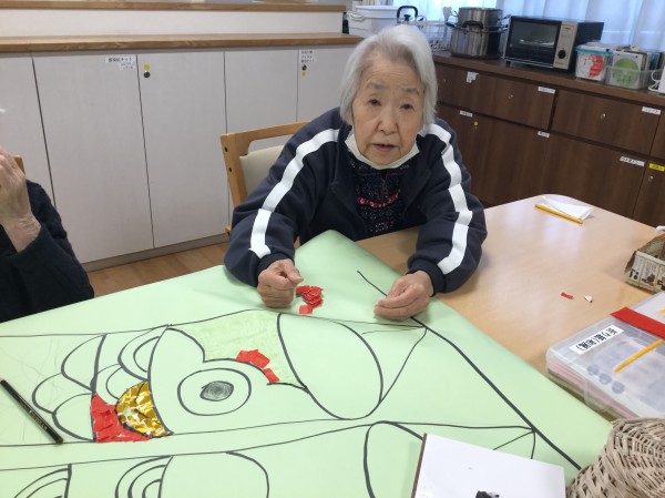 こちらは5月の壁紙作り。鯉のぼりを書いた職員も利用者様に「鯉のぼりに見えますか??」と聞きながら下絵を書きました。「(鯉のぼりに)見えるよ~♬と優しい利用者様の声で下絵も完成。 現在、制作中です。みんなで力を合わせて頑張りまーす。完成をお楽しみに♬