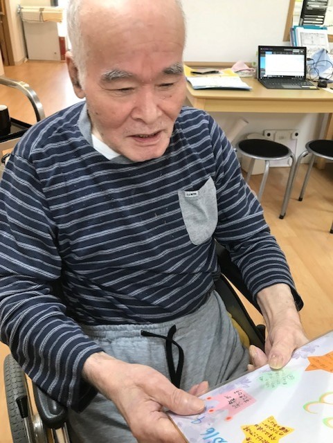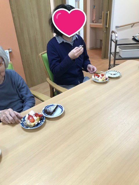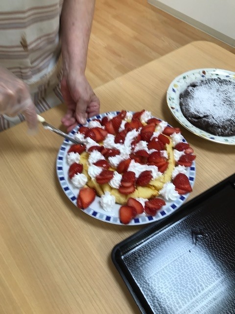 4月のお誕生日、2名の方のお祝いをしました。今回は2種類のケーキを作り見た目も華やかに。皆さん身を乗り出して見て下さいました。