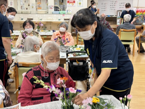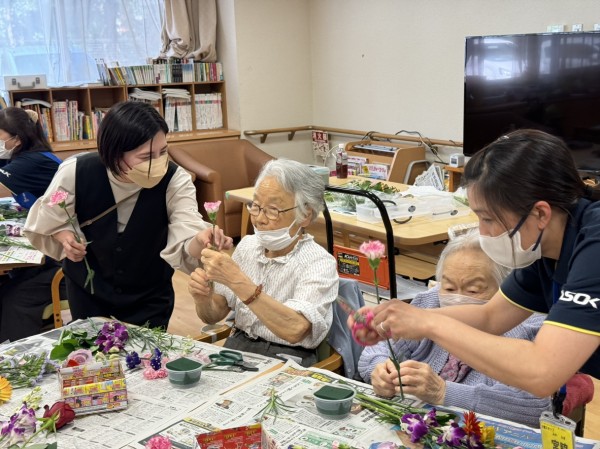 特別合同企画(デイサービス遊・西東京とデイサービスひばりが丘)です! 皆様楽しみにされていました企画です。まず、新聞を下に敷き切り花や『オアシス』等、材料をテーブルの上に準備しました!