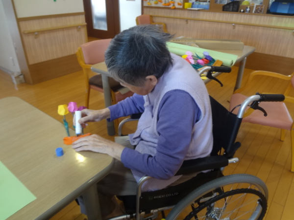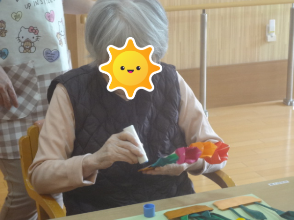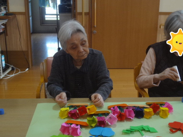 ご利用者様にも春の訪れを感じていただきながら、チューリップとタンポポ、綿毛を折り紙で作った壁飾りです(^^♪