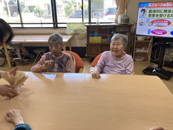1階でも割り箸ジェンガゲーム(順に割り箸を抜いていく。バランスを崩し倒した方が負け。割り箸を多く抜いた方が優勝。) を行いました。皆さん真剣に無言で勝負されていました。崩れる瞬間は悲鳴を上げられるなど、大盛り上がりでした(^_^)/