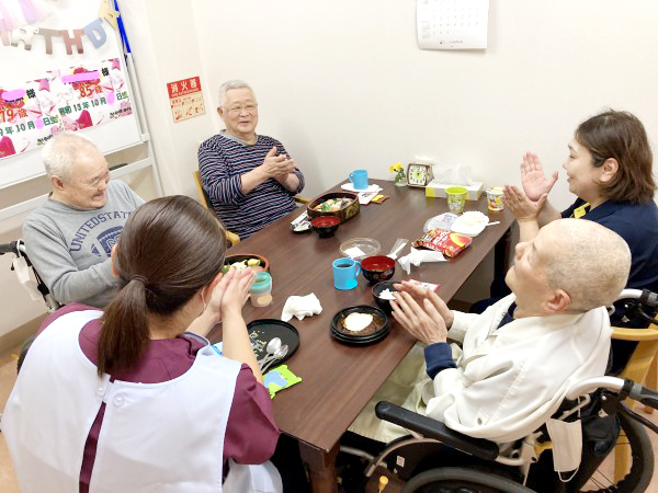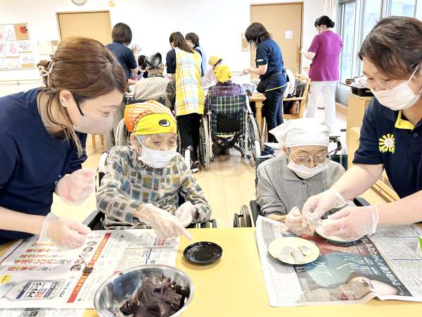 ホームでは季節イベントやレクリエーションなど、職員たちが企画して皆さんに楽しい時間を提供しております。今回は200個を超える手作り餃子を作りノンアルコールをお供に出来立てを楽しみました!