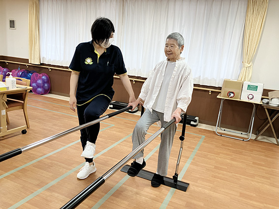 1周40mのトラックをウォーキングしたり、踏み台昇降運動や平行棒を利用したりと