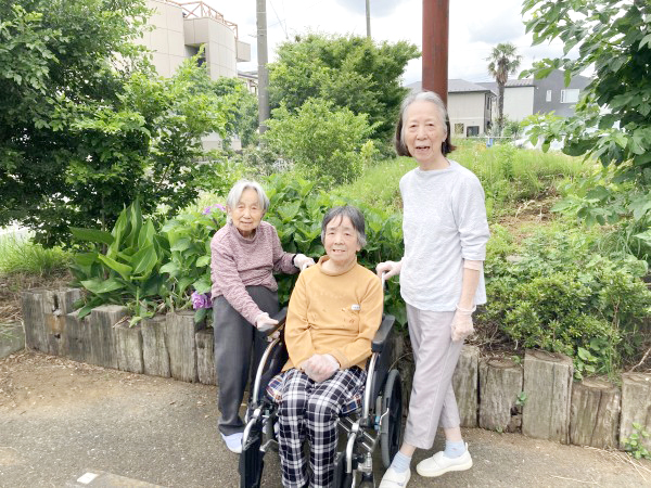 みんなの家・与野大戸の周りは公園や畑も多く、緑豊かなエリアです。ホームの敷地内も緑が豊かでのんびりとお過ごしいただける環境です。一息ついたところをパチリ★
