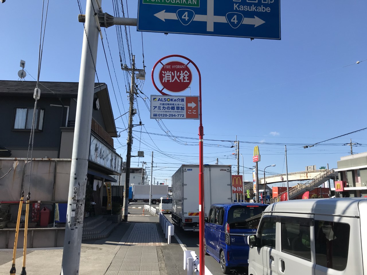 駅から来ても、国道4号線から来ても分かりやすい所に消火栓の看板を目印として設置してます。