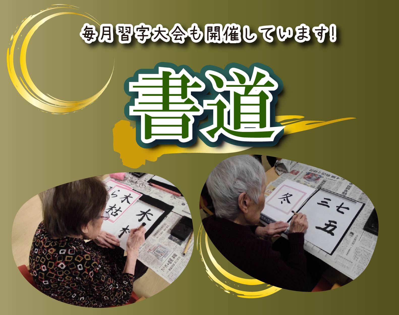 毎月習字大会を行っています。習字レクリエーションは、学校や習い事などで習字を書かれていた過去を想起して頂く効果と、「次はもっと奇麗に書きたい!!」などの意欲が自然に湧いてくる効果があるため、今後も皆様に楽しんで参加していただきたいです。