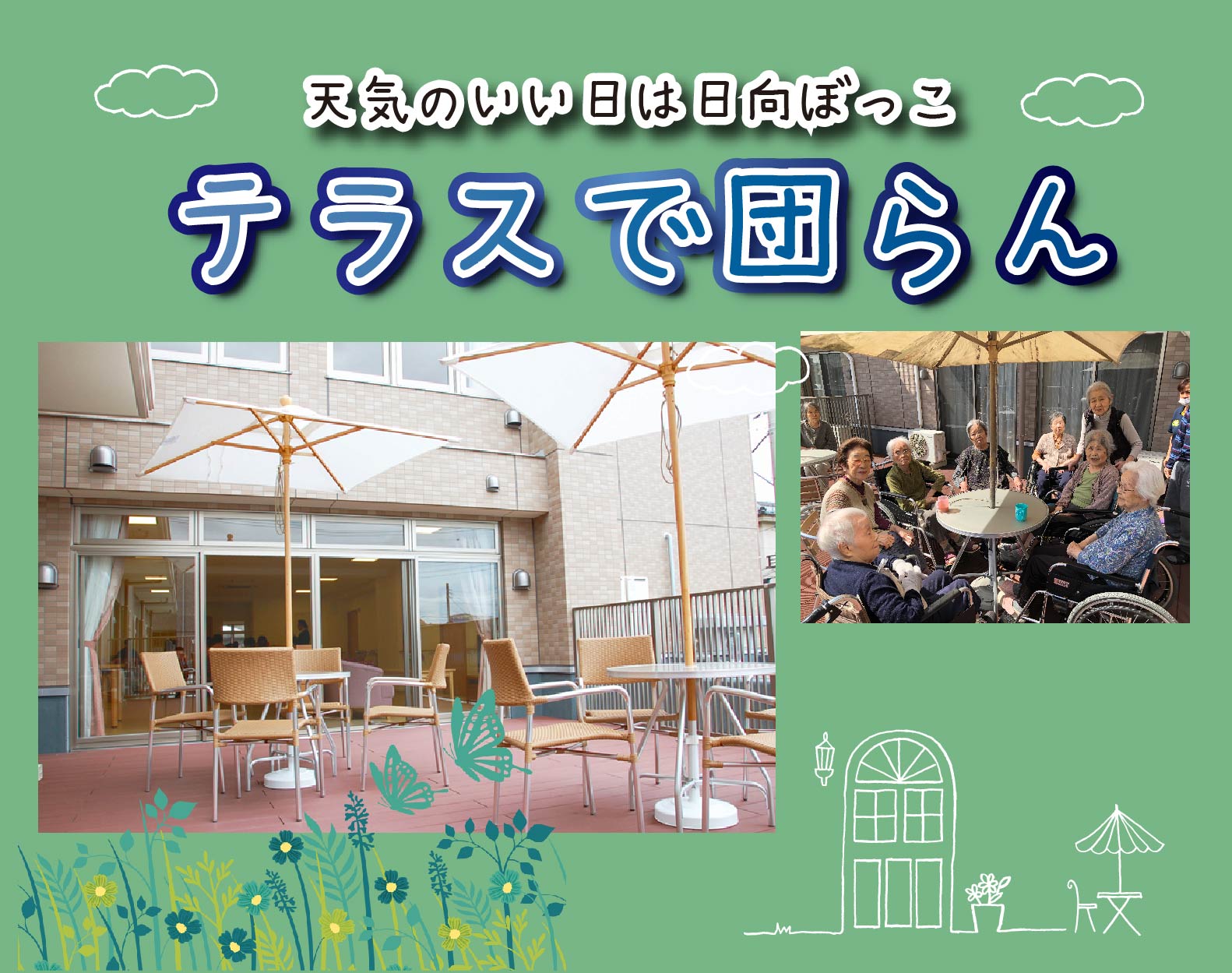 アミカの郷川口は広いテラスがございます。お天気のいい日はここでおしゃべりしながらお茶会をしたり、日光浴をしたり楽しんでいます!